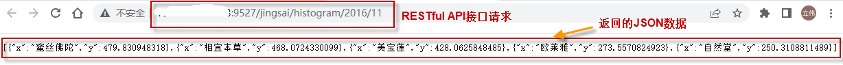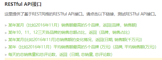 可以点开任意一个链接测试。比如,点开第一个链接"某年某月(比如2016年11月)销售额最高的5个品牌,返回(品牌,销售额)",它会请求RESTful API接口,并接收返回的JSON数据,如下图所示:
