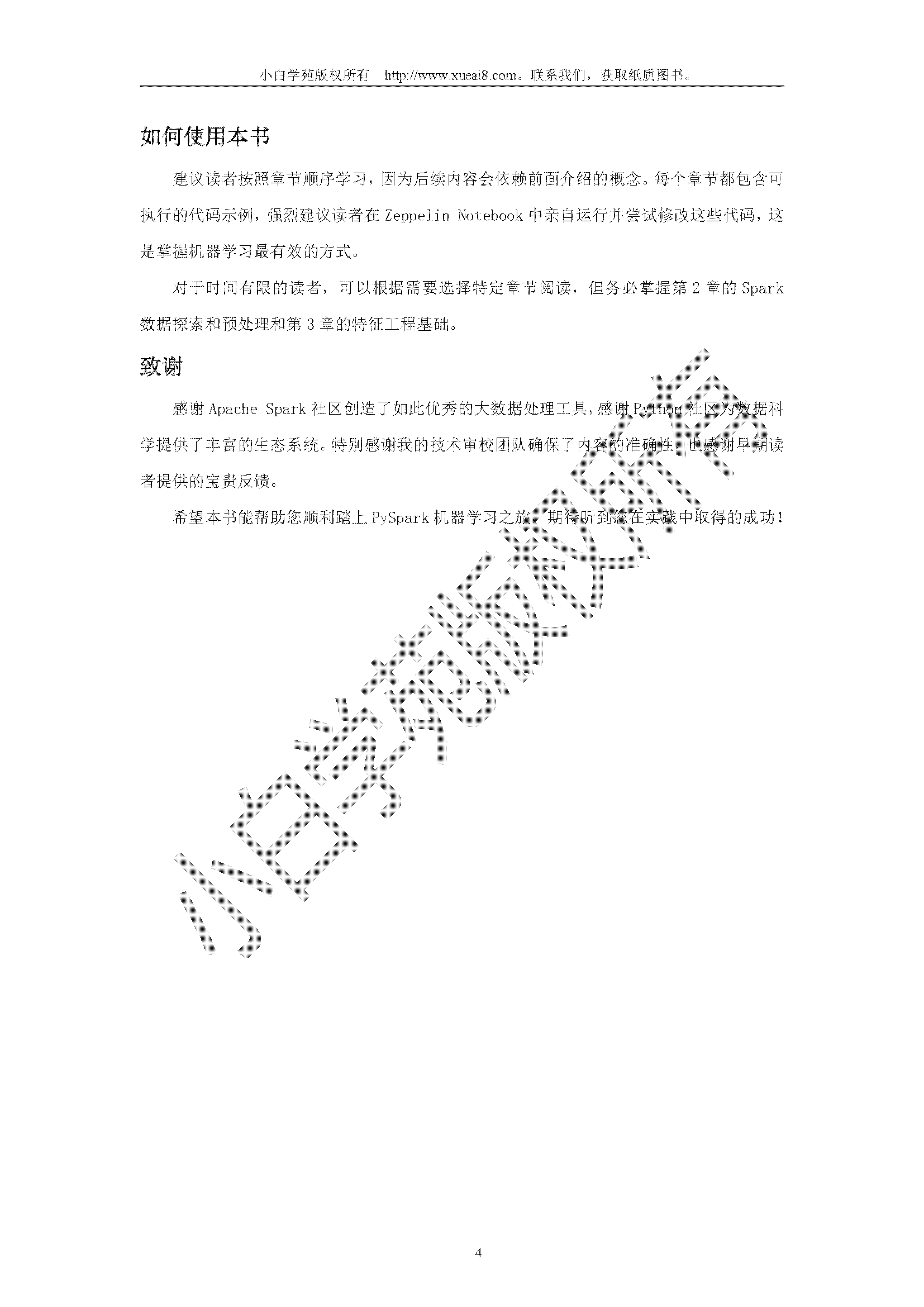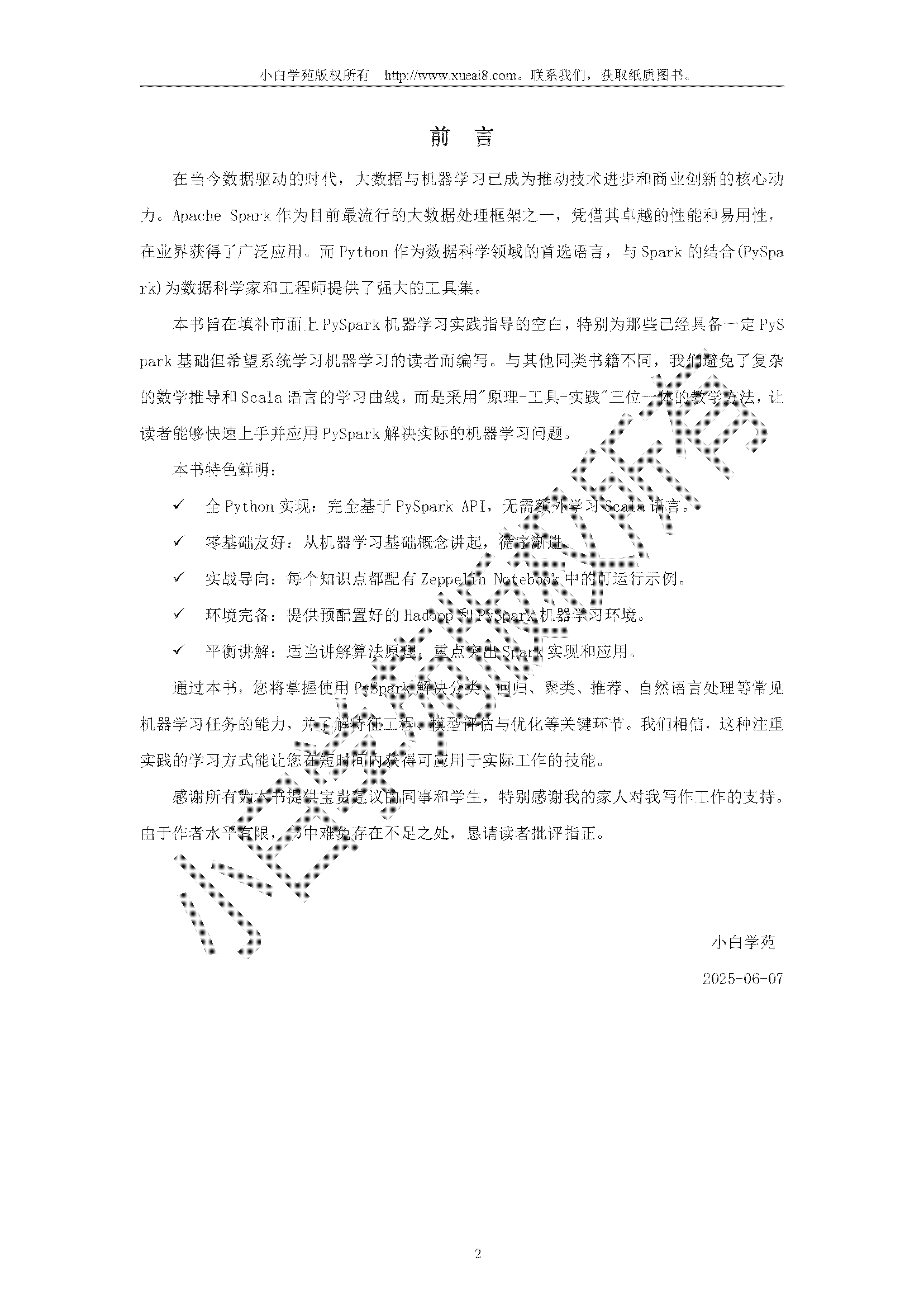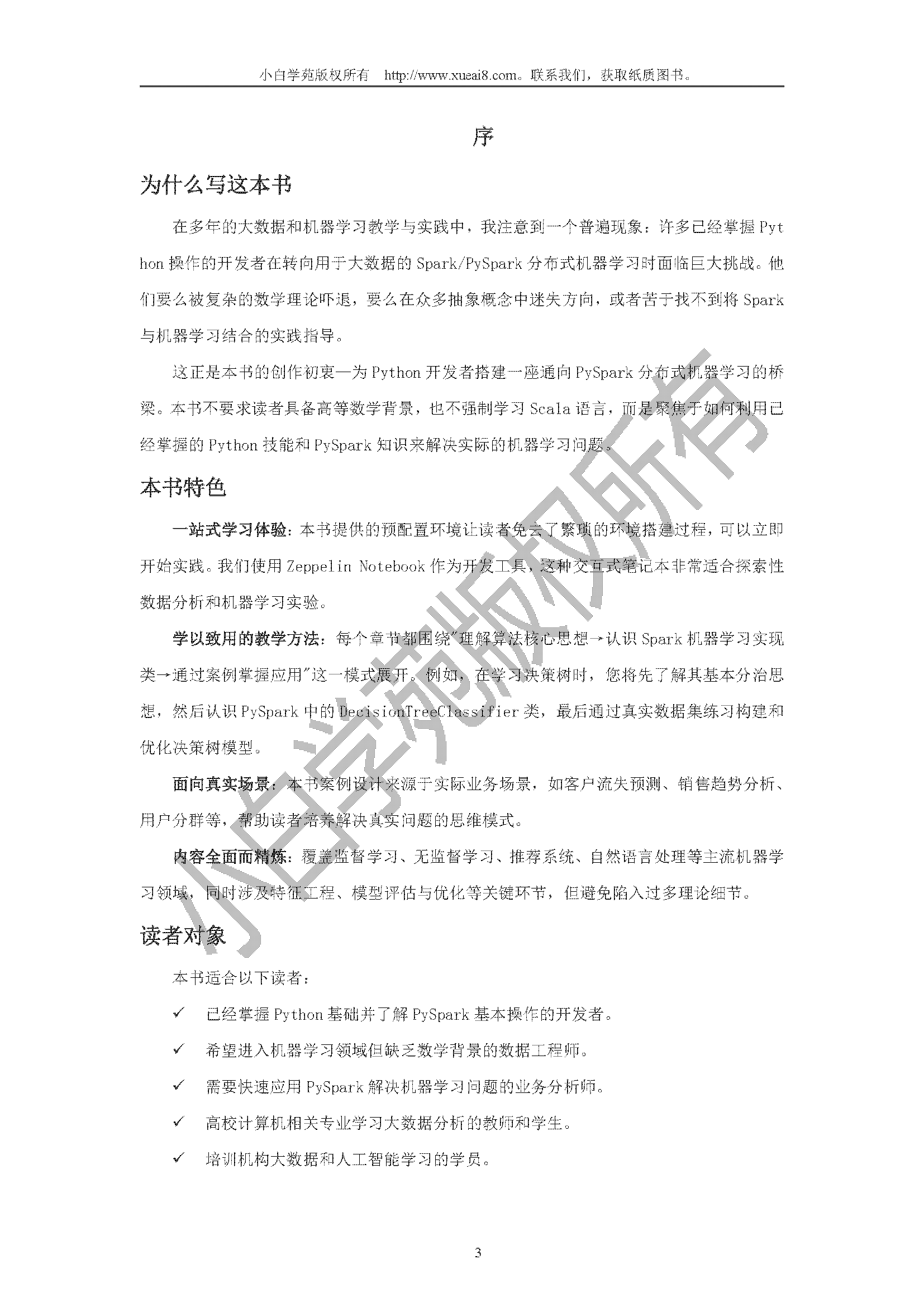 本书专为有一定 Spark 基础,但机器学习知识尚处零基础阶段的读者量身打造。我们深知,许多读者怀揣着利用 Spark 开发机器学习应用的热情,却发现市面上多数机器学习资料紧密围绕 Python机器学习库展开,使得不熟悉 Python机器学习库的读者望而却步。本书正是为解决这一痛点而生,我们将带领读者探索基于Python语言的Spark 的机器学习开发之路,无需过度依赖 Python 机器学习框架,为您扫除学习障碍。