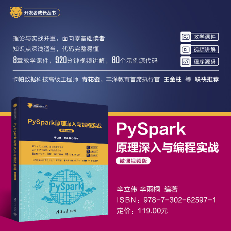 基本信息 《PySpark原理深入与编程实战》 清华大学出版社出版,基于Spark 3.1.2和Python 3.x,面向入门小白的PySpark系统教程和案例图书。 页数:535 详细介绍 《PySpark原理深入与编程实战》,基于Spark 3.1.2,Python 3.x实现。 出版社:清华大学出版社。 出版日期:2023年08月。 京东网链接 天猫网链接 当当网链接 详细介绍