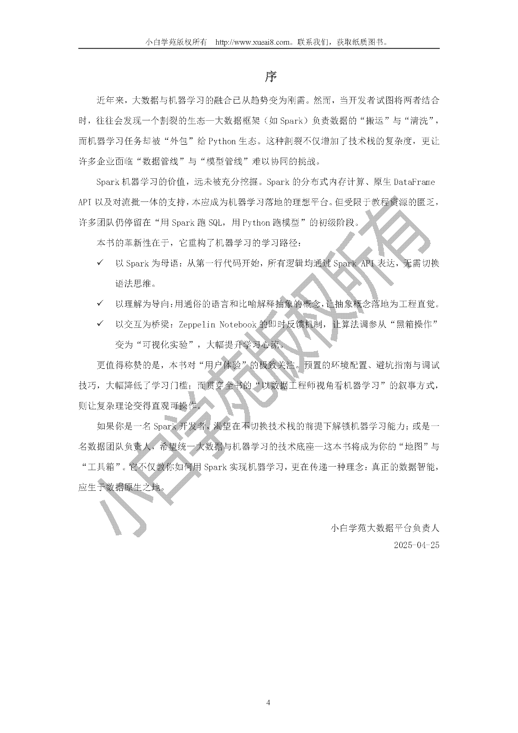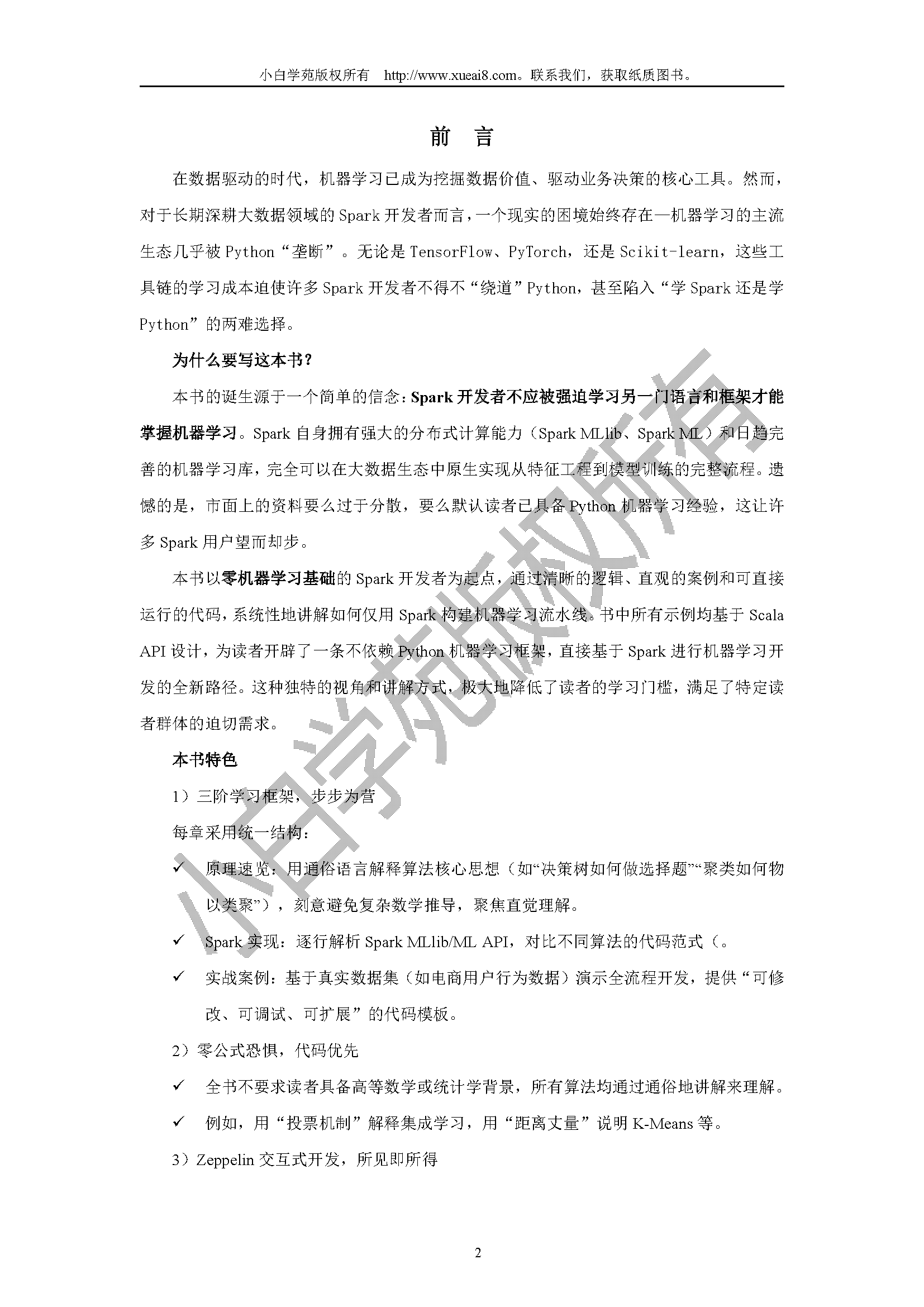 本书专为有一定 Spark 基础,但机器学习知识尚处零基础阶段的读者量身打造。我们深知,许多读者怀揣着利用 Spark 开发机器学习应用的热情,却被 Python 这一在机器学习领域广泛使用的编程语言所阻碍。市面上多数机器学习资料紧密围绕 Python 展开,使得不熟悉 Python 的读者望而却步。本书正是为解决这一痛点而生,我们将带领读者探索基于Scala语言的Spark 的机器学习开发之路,无需过度依赖 Python 机器学习框架,为您扫除学习障碍。