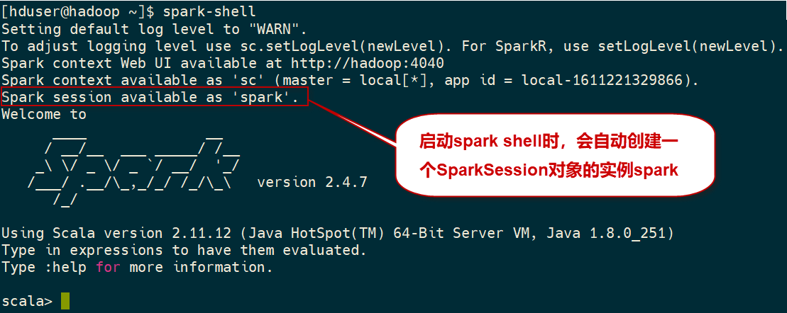 在Spark程序中,我们使用构建器设计模式实例化SparkSession对象。然而,在REPL环境中(即在Spark shell会话中),SparkSession会被自动创建,并通过名为spark的实例对象提供给我们使用。