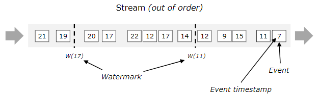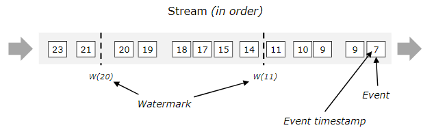 下图显示了带有(逻辑的)时间戳的事件流,以及内联流动的水印。在这个例子中,事件是按顺序排列的(相对于它们的时间戳),这意味着水印只是流中的周期标记。