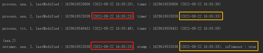System.out.println(String.format("ontimer, %s, %d, lastModified : %d (%s), stamp : %d (%s), isTimeout : %s\n\n",