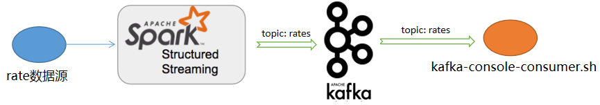 在这个示例中,Spark结构化流程序会向Kafka的“rates”主题发送消息(本例为读取自Rate数据源的数据),我们用Kafka自带的消费者脚本程序订阅该主题。一旦它收到了订阅的消息,马上输出。程序处理流程如下图所示: