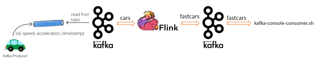 在这个案例中,我们使用Kafka作为流数据源,将从Kafka的“cars”主题来读取这些事件。同时也将Kafka作为流的Data Sink,检测出的超速事件将写入到Kafka的“fastcars”主题。