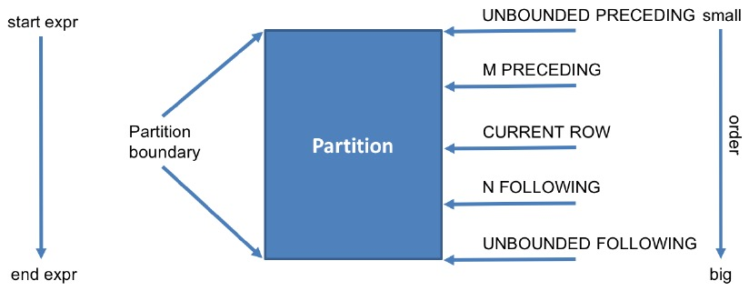 窗口函数定义规范中的第三个组件window_expression用于确定窗口边界,如下图所示:
