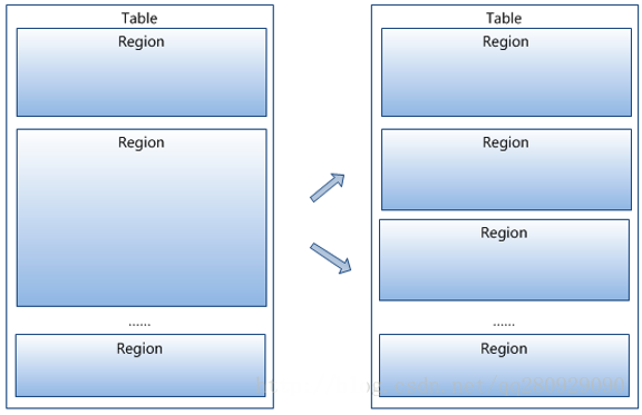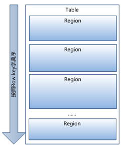 Region按大小分割的,每个表一开始只有一个Region,随着数据不断插入表,Region不断增大,当增大到一个阀值的时候,Region就会等分会两个新的Region。在物理存放时,Region会被存储至不同的HRegion Server上,形成分布式的存储模式。