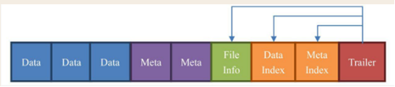 2)Meta:元数据块。Meta也是可选的,Meta块只有在文件关闭的时候才会写入,Meta存储了该文件的元数据信息。