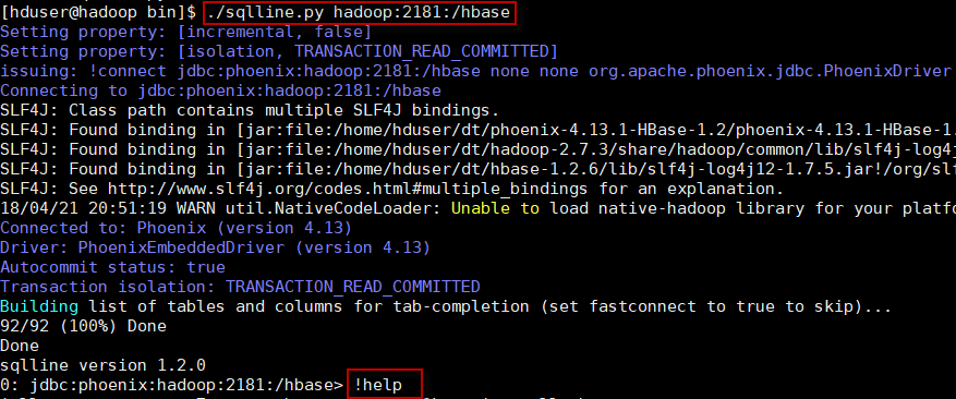 $ cd ~/bigdata/phoenix-4.15.0-HBase-1.4 $ ./bin/sqlline.py localhost:2181:/hbase