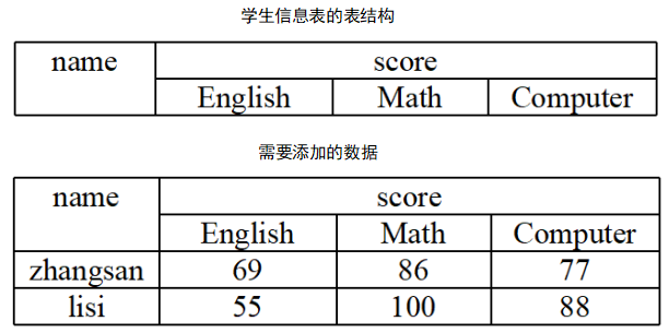 创建一个学生信息表,用来存储学生姓名(姓名作为行键,并且假设姓名不会重复)以及考试成绩,其中,考试成绩是一个列族,分别存储了各个科目的考试成绩。学生信息表的表结构和需要添加的数据如下表所示。