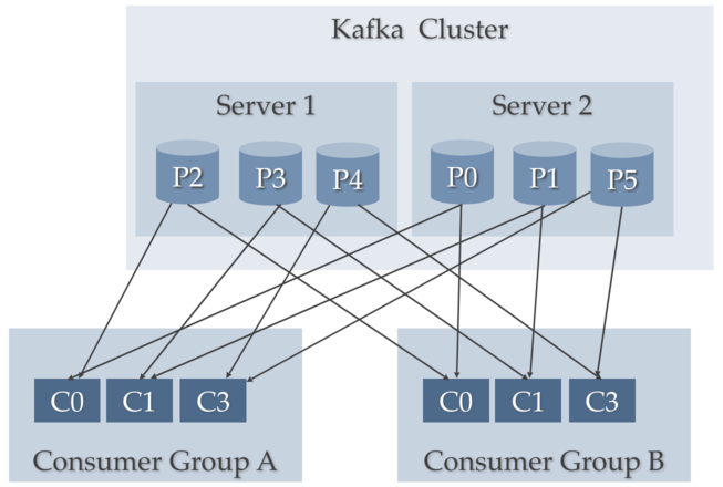 下图显示了在具有2个Kafka服务器、6个分区和2个消费者组的Kafka集群中,消费者组中消费者到分区的关系。