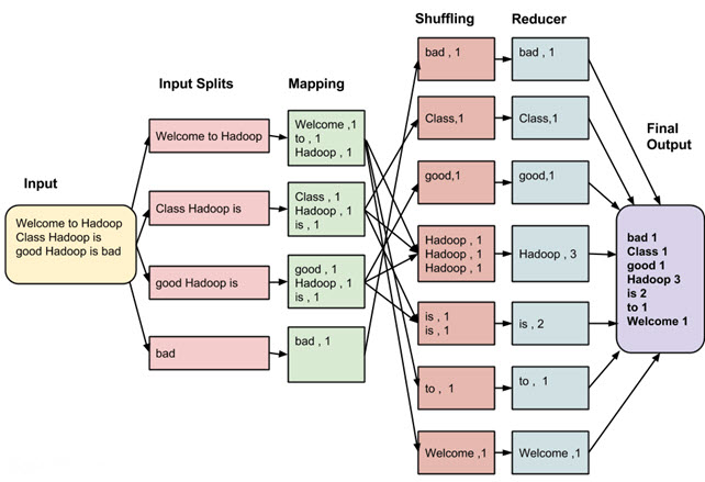 - mapping:这是执行map-reduce程序的第一个阶段。在这个阶段中,每个分片中的数据被传递给一个map函数以产生输出值。 在我们的示例中,map阶段的工作是统计每个单词从输入分片中出现的次数,并准备一个<单词,频率>的列表。