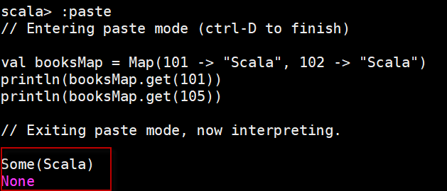 val booksMap = Map(101 -> "Scala", 102 -> "Scala") println(booksMap.get(101)) println(booksMap.get(105))