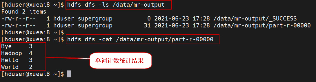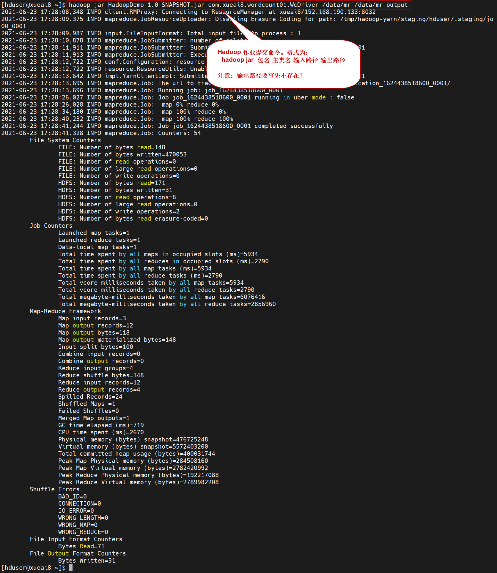 $ hadoop jar HadoopDemo-1.0-SNAPSHOT.jar com.xueai8.wordcount01.WcDriver /data/mr /data/mr-output