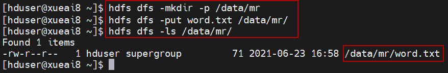 $ hdfs dfs -mkdir -p /data/mr $ hdfs dfs -put word.txt /data/mr/ $ hdfs dfs -ls /data/mr/