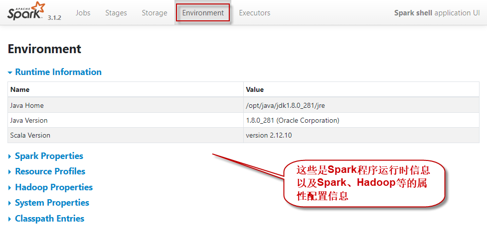 在Spark Web UI的Environment页面,可以查看影响Spark应用程序的配置参数的完整列表。如下图所示: