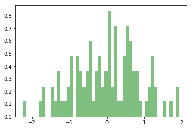 n, bins, patches = plt.hist(rdd.collect(), num_bins, density=1, facecolor='green', alpha=0.5)