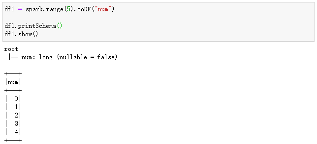 # 创建单列DataFrame,默认列名是id,类型是LongType df = spark.range(5) df.printSchema() df.show()