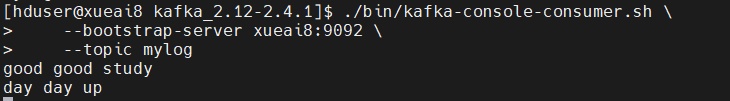 # 切换到Kafka的安装目录 $ cd ~/bigdata/kafka_2.12-2.4.1 # 创建一个名为mylog的topic $ ./bin/kafka-topics.sh --create \ --zookeeper localhost:2181 \ --replication-factor 1 \ --partitions 1 \ --topic mylog