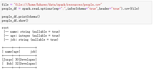 file = "file:///home/hduser/data/spark/resources/people.csv" people_df = spark.read.options(sep=";",inferSchema="true",header="true").csv(file) people_df.printSchema() people_df.show()