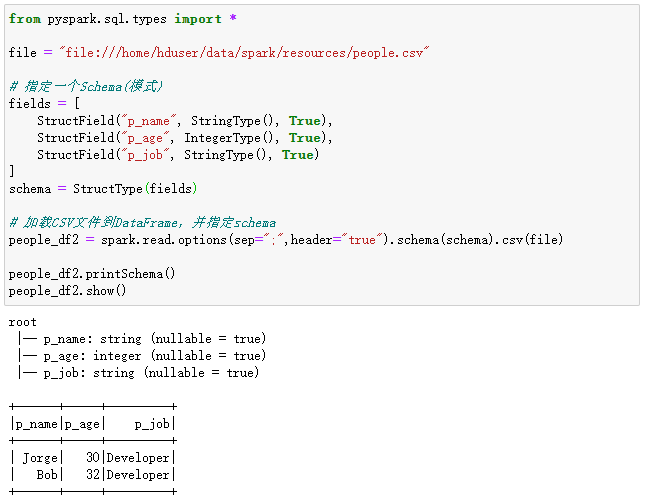 // 数据源文件 file = "file:///home/hduser/data/spark/resources/people.csv" people_df = spark.read.load(file, format="csv", sep=";", inferSchema="true", header="true") people_df.printSchema() people_df.show()