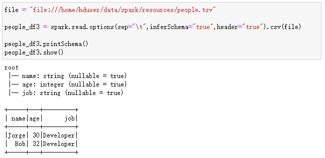 file = "file:///home/hduser/data/spark/resources/people.tsv" people_df3 = spark.read.options(sep="\t",inferSchema="true",header="true").csv(file) people_df3.printSchema() people_df3.show()