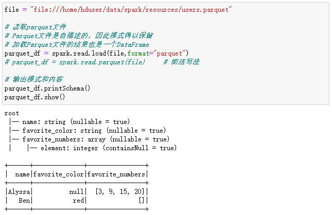 file = "file:///home/hduser/data/spark/resources/users.parquet" # 读取parquet文件 # Parquet文件是自描述的,因此模式得以保留 # 加载Parquet文件的结果也是一个DataFrame parquet_df = spark.read.load(file,format="parquet") # parquet_df = spark.read.parquet(file) # 简洁写法 # 输出模式和内容 parquet_df.printSchema() parquet_df.show()