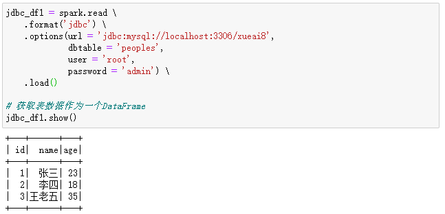 然后编写如下的代码,来读取peoples表中的数据到DataFrame中。