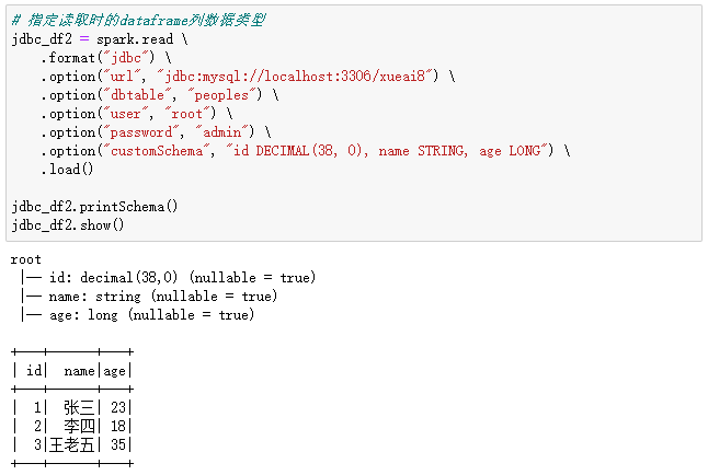 在读取JDBC关系型数据库中的表数据时,也可以指定相应的DataFrame的列数据类型。