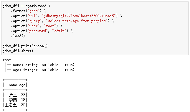 // 数据源文件 file = "file:///home/hduser/data/spark/resources/people.json" # json解析;列名和数据类型隐式地推断 people_df4 = spark.read.load(file, format="json") # people_df4 = spark.read.json(file) # 简洁方法 people_df4.printSchema() people_df4.show()
