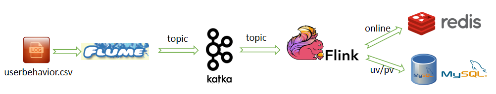 启动业务系统,按照要求使用Flume将用户操作日志采集并存入Kafka中并使用Flink、Scala消费Kafka中的数据将其进行聚合计算出商城在线人数,将结果存入Redis中,并统计该电商系统的UV与PV将结果存入MySQL中。