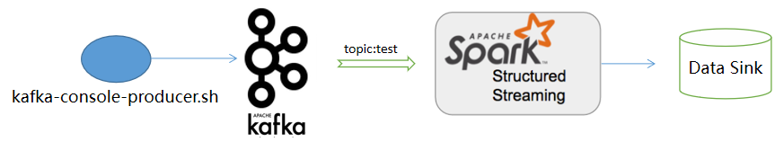 在这个示例中,我们使用Kafka自带的生产者脚本向Kafka的test主题发送内容,而PySpark结构化流程序会订阅该主题。一旦它收到了订阅的消息,马上输出到控制台中。程序处理流程如下图所示: