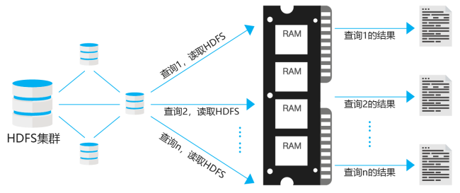 Hadoop出现后,迅速成为许多大型分布式数据处理基础设施的基石。但是很快,人们意识到Hadoop的局限性。Hadoop解决方案最适合于特定类型的大数据需求,比如ETL。但是经常有这样的需求场景:数据工程师或分析人员必须对数据集进行交互式数据分析的即席查询。每当在Hadoop上运行查询时,Hadoop都会从HDFS中读取数据并加载到内存中,这个过程很慢。实际上,作业(Job)的运行速度是由网络和磁盘集群的传输速度决定的,而不是CPU和RAM的速度。如图所示: