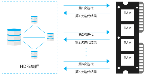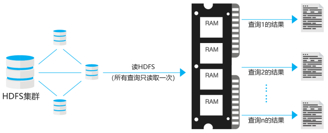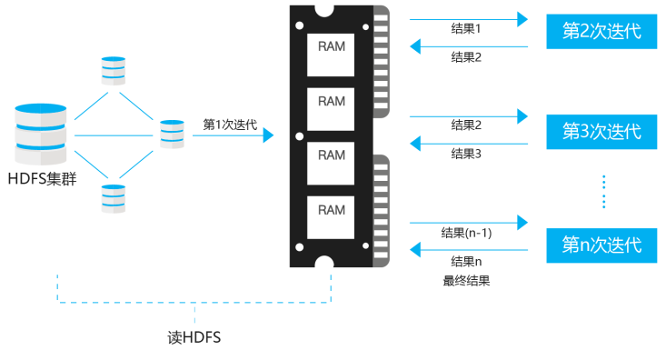 下图演示了Spark的内存计算模型。Spark一次性从HDFS中读取所有的数据并以分布式的方式缓存在计算机集群中各节点的内存中。
