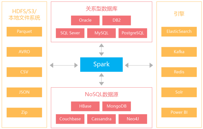 Spark可以连接到许多不同的数据源,包括文件(CSV,JSON,Parquet,AVRO)、MySQL、MongoDB、HBase和Cassandra。此外,它还可以连接到特殊用途的引擎和数据源,如ElasticSearch、Apache Kafka和Redis。这些引擎支持Spark应用程序中的特定功能,如搜索、流、缓存等。Spark提供了DataSource API以支持到各种数据源(包括自定义数据源)的Spark连接。