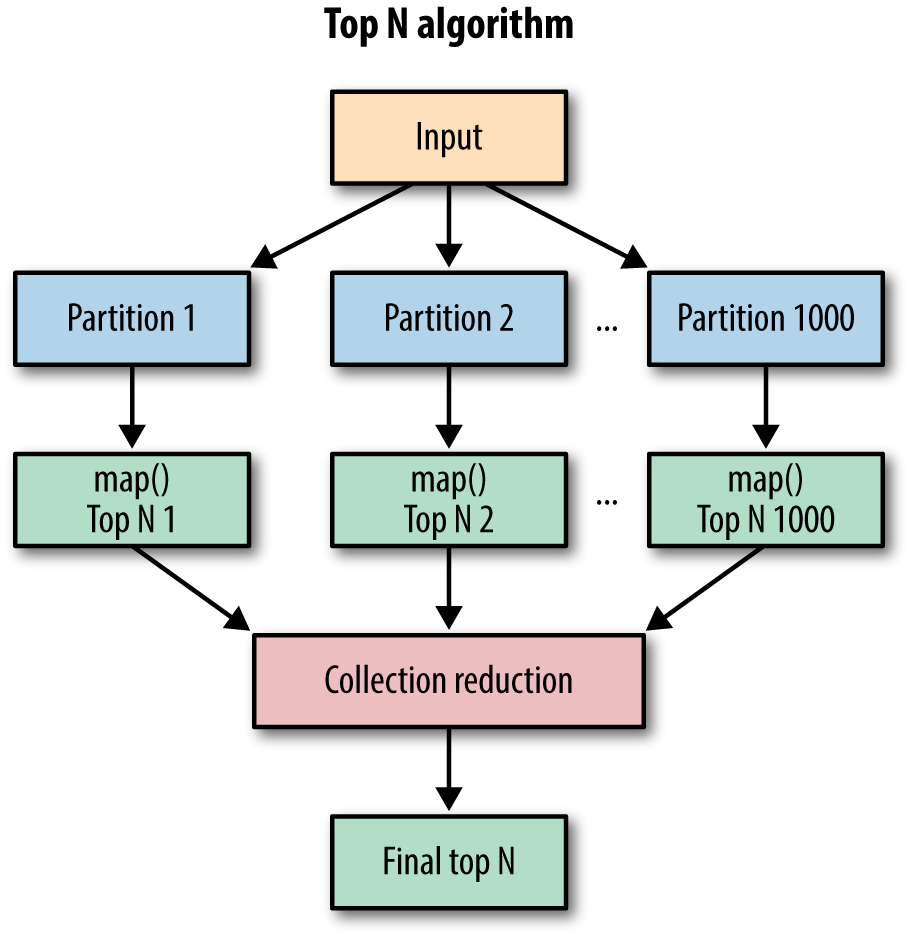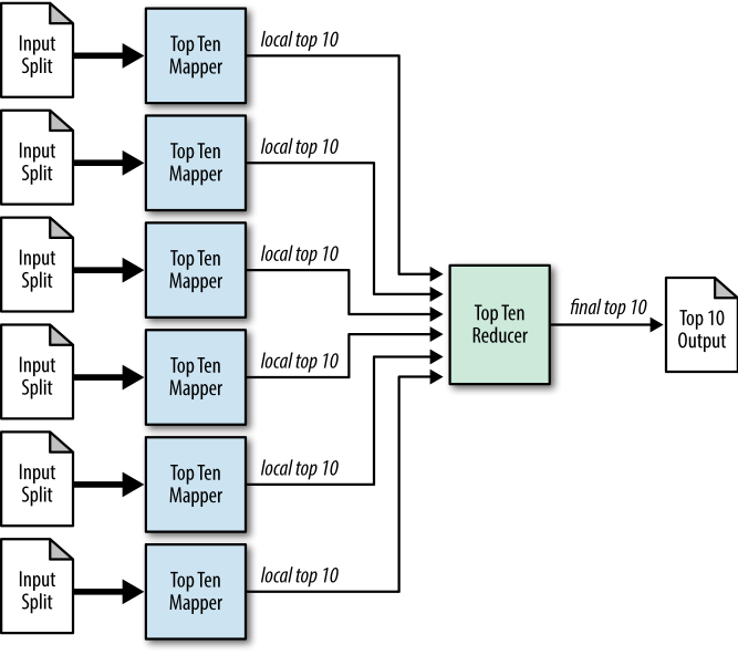 每个Mapper找出本地的Top N列表(N>0),然后将它传给同一个Reducer。然后这个Reducer从这些Mappers传过来的所有的本地Top N列表中找出最终的Top N项。