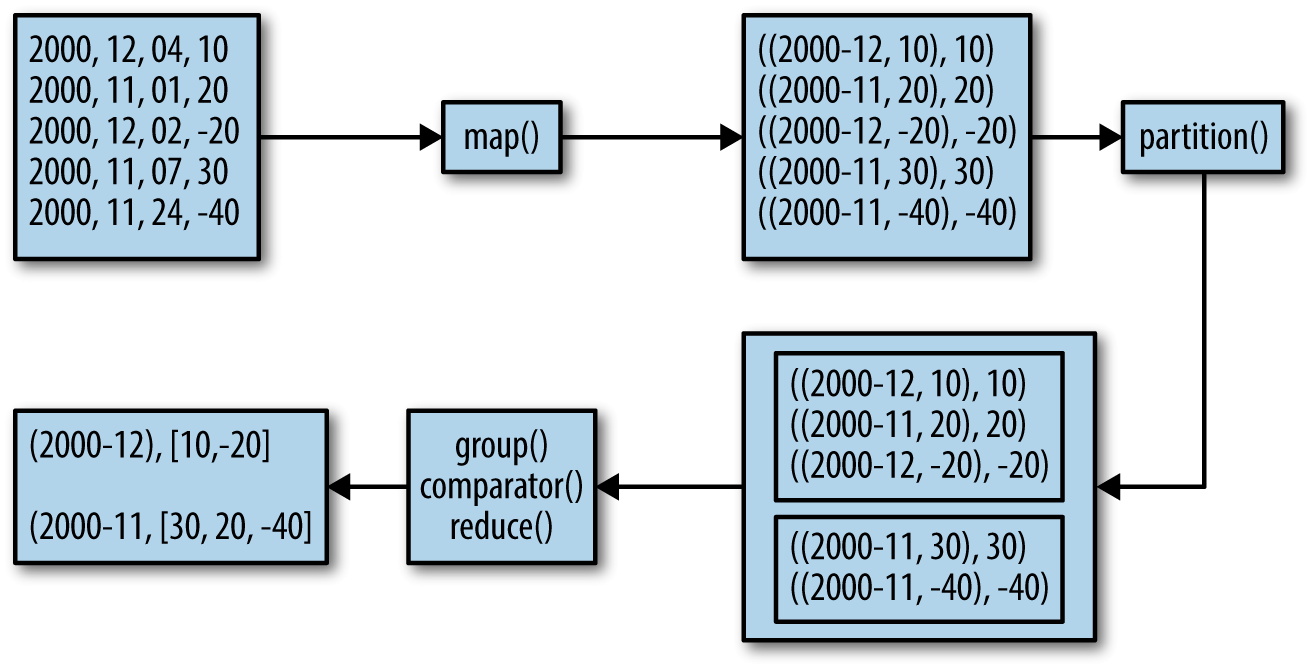 我们可以使用Hadoop框架中一个叫做”二次排序”的机制来排序Reduce输入值。其原理如下。