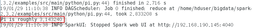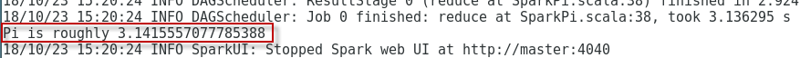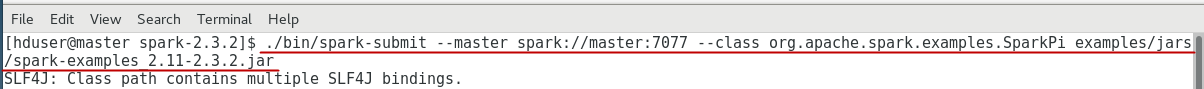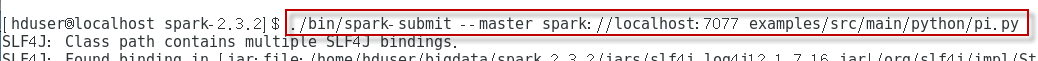 $ cd ~/bigdata/spark-2.4.5 $ ./bin/spark-submit --master spark://master:7077 examples/src/main/python/pi.py