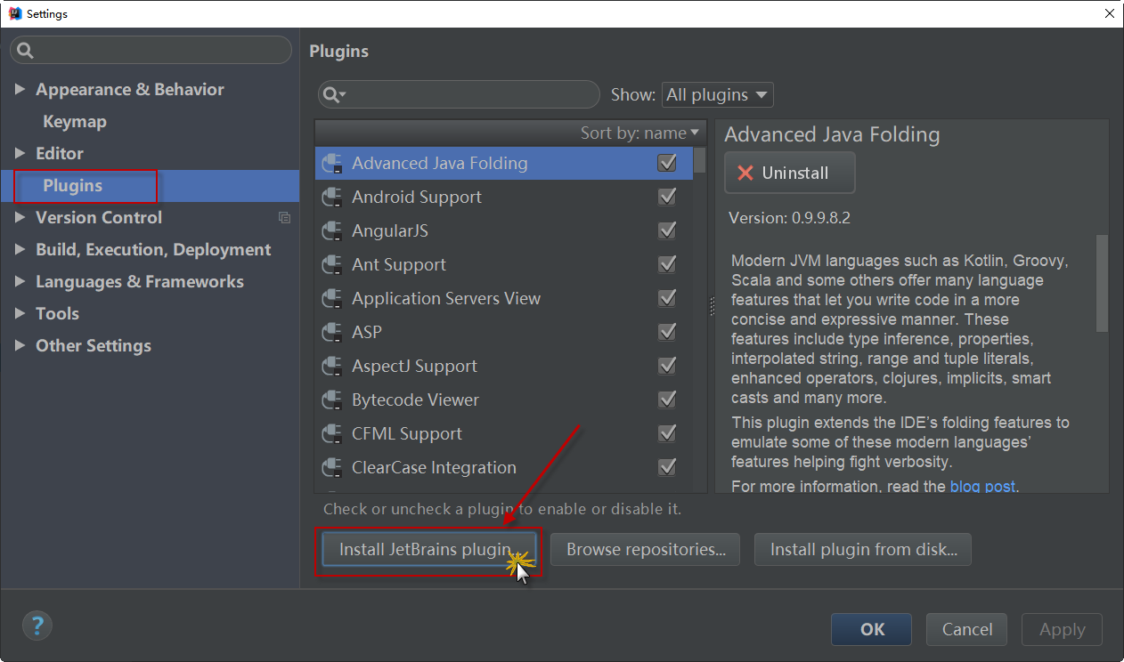 1)在IDEA启动界面上选择“Configure-->Plugins”选项(或者在项目界面,选择“File > Settings... > Plugins”),然后弹出插件管理界面,在该界面上列出了所有安装好的插件。由于Scala插件没有安装,需要点击“Install JetBrains plugins”进行安装,如下图所示: