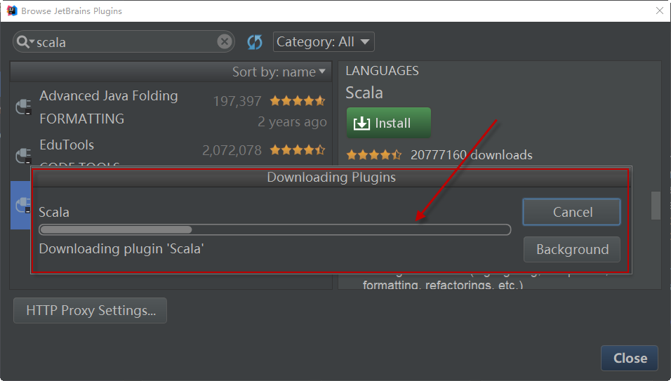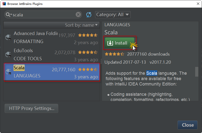 2)待安装的插件很多,可以通过查询或者字母顺序找到Scala插件,选择插件后在界面的右侧出现该插件的详细信息,点击绿色按钮“Install plugin”安装插件,如下图所示: