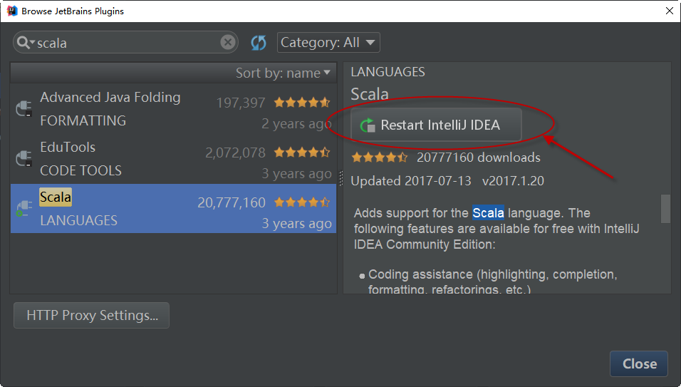 4)安装完成后,将看到一个按钮,用于重新启动IntelliJ IDE。继续并点击它来重启我们的IntelliJ: