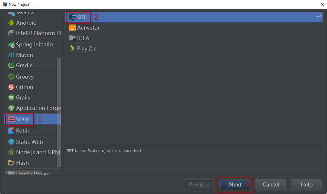 2)接下来,依次选择【Scala】|【sbt】,然后单击【Next】按钮。如下图所示: