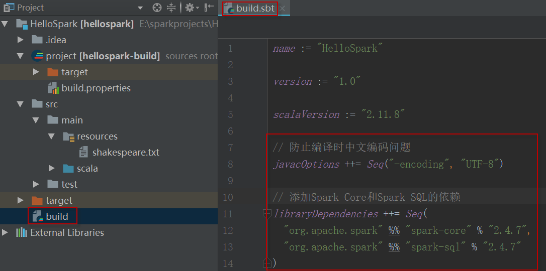 在开始编写Spark应用程序之前,我们需要将Spark库和文档导入IntelliJ,这需要在build.sbt文件中进行配置。编辑build.sbt文件,创建工程时生成的初始内容如下:
