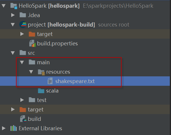 1)回到项目中,在src/main下创建一个名为resources的文件夹(如果它不存在的话),并将shakespear .txt拷贝到该文件夹下。