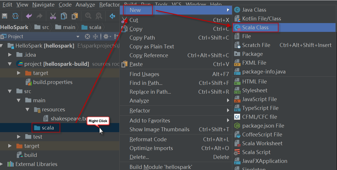 2)接下来,在src/main/scala下创建一个新类。右击“scala > New > Scala Class”,如下图所示:
