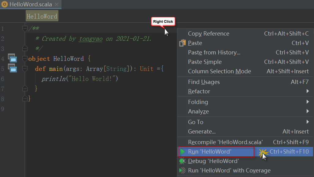 5)运行程序。在文件上任何位置单击右键,在弹出的环境菜单中,选择【Run 'HelloWord'】。