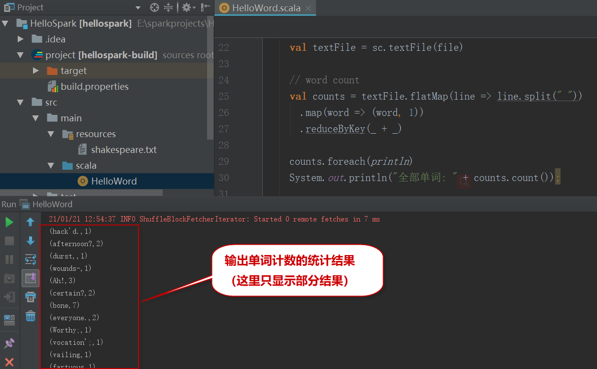8)和刚才一样,右键单击,并选择【Run ' HelloScala'】来运行程序。这将运行Spark作业并打印莎士比亚作品中出现的每个单词的频率,预期输出如下: