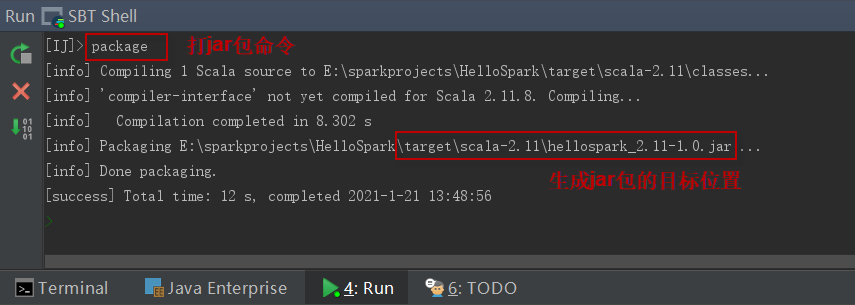 这将在项目的“target/scala-2.11”下创建一个名为“hellospark_2.11-1.0”的编译过的jar文件。