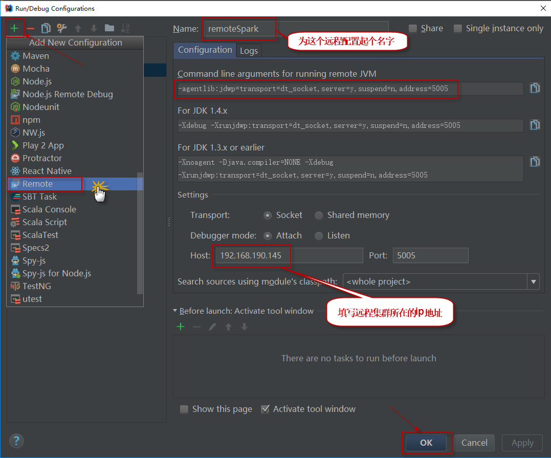 4)然后单击左上角的+按钮,选择面板左侧的Remote项,增加一个新的远程配置。在面板右侧,使用主机ip地址填写Host(Port字段默认为5005,不需要修改),这将允许在端口5005上关联调试器。需要确保端口5005能够接收入站连接。