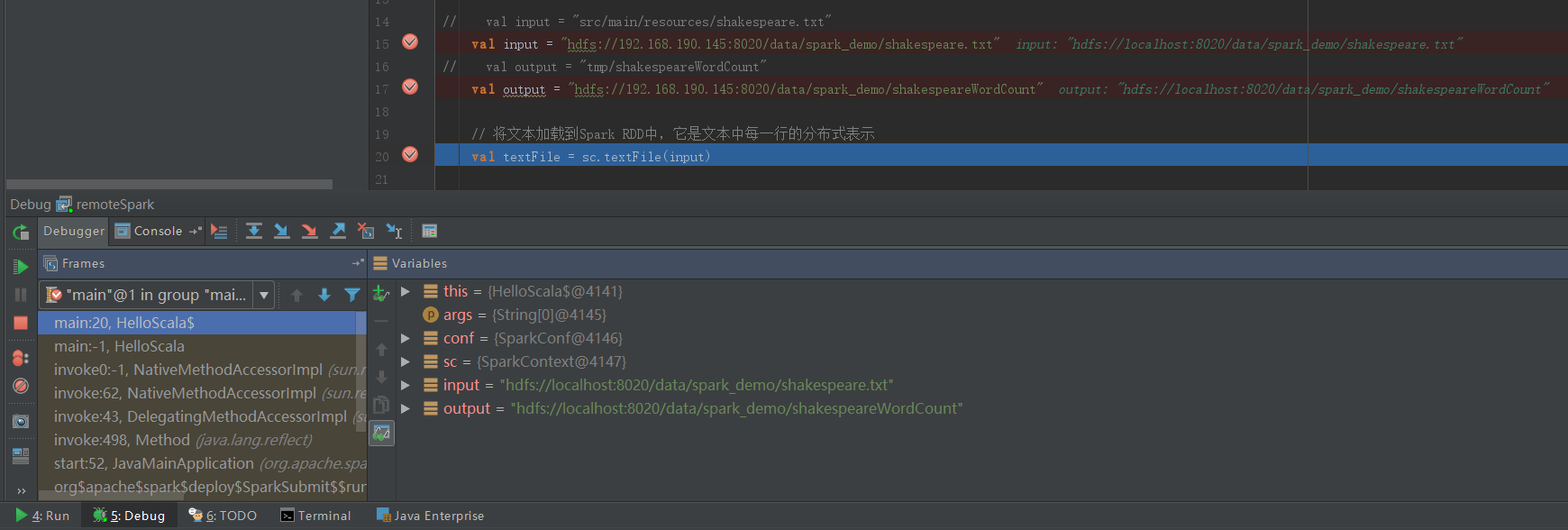 5)从IDE中debug此调试配置,调试器将附加此调试配置,并且远程Spark程序将在断点处停止。还可以检查程序中活动变量的值。在试图确定代码中的bug时,这是非常宝贵的。